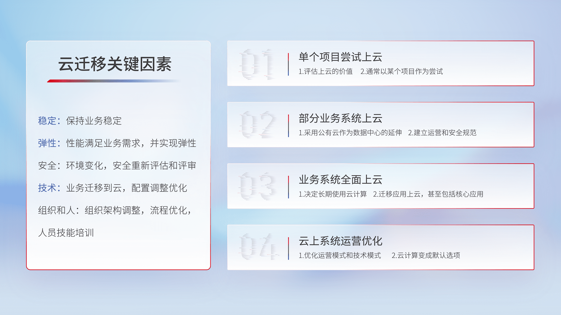 结合实际业务,,从规划设计、、、云平台选型、、云原生改造、、、、数据迁移、、集成交付,,迁移全过程为客户识别最佳上云路径,,,做好风险识别管理,,,设计网络架构、、身份权限、、安全审计合规、、操作审计、、日志审计、、、、监控告警策略、、、多站点容灾设计等,,,,对云上基础设施进行整体规划,,提升IT治理水平,,,以满足弹性、、、、高可用、、高性能的需求。。
