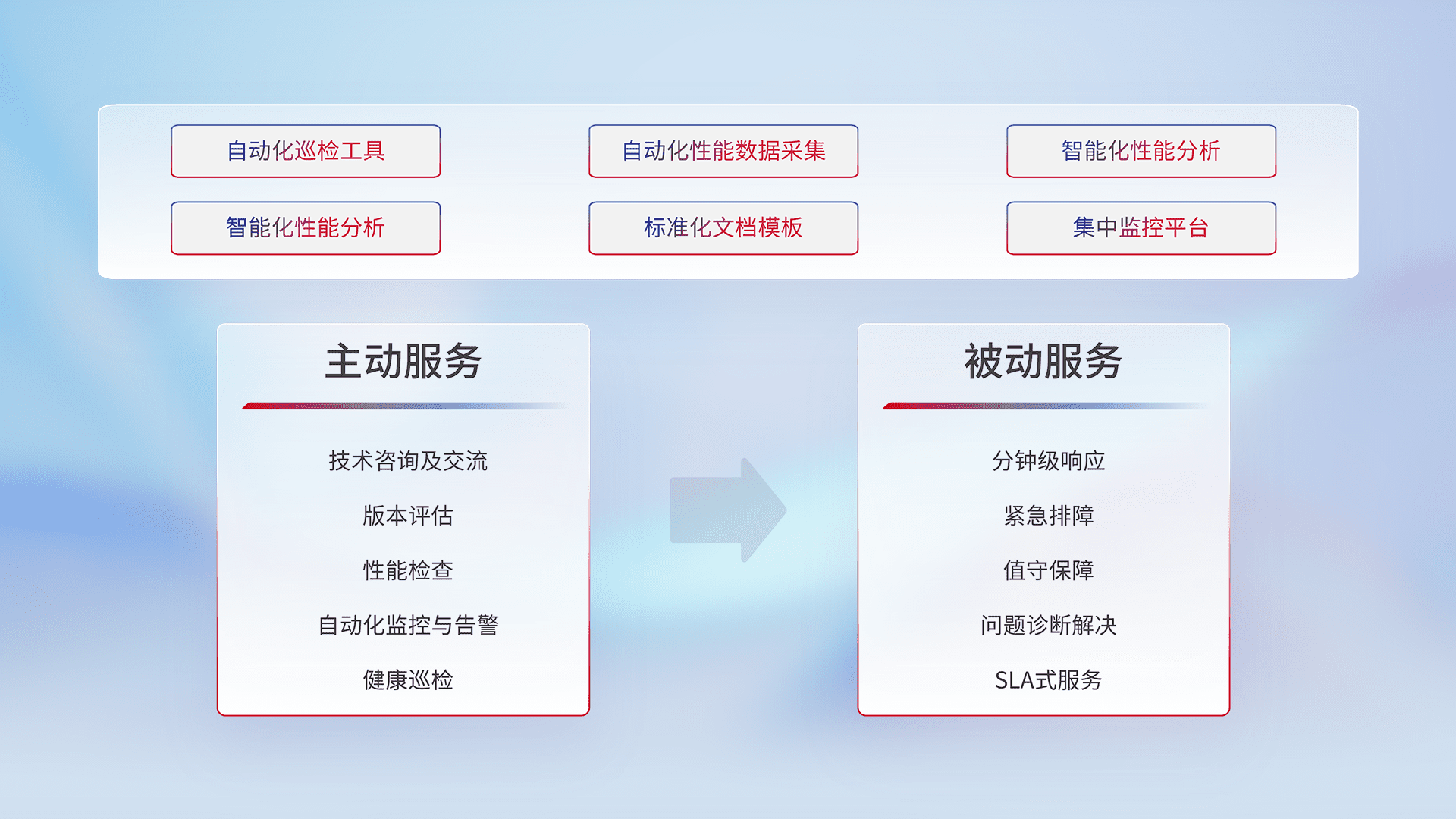 智能化工具和标准化文档,,,,保障服务质量,,,,提供主动服务(包含技术咨询、、版本评估、、、、性能检查、、、自动化监控与告警、、健康巡检)和被动服务包含(分钟级响应、、、、紧急排障、、、、值守保障、、、、问题诊断解决、、、、SLA服务)。。。